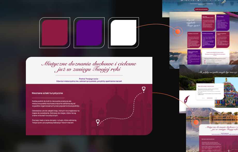 Перед нами стояла задача создать сайт для компании, специализирующейся на духовных путешествиях и ретритах, проводимых в Индии. Главная цель заключалась не просто в информировании о турах, а в создании эмоционального пространства, которое бы отражало суть таких поездок — внутренние трансформации, медитативные практики, личные встречи с наставниками и путь к себе. Важно было передать атмосферу глубины, умиротворения и вдохновения, которую участники получают во время этих путешествий.