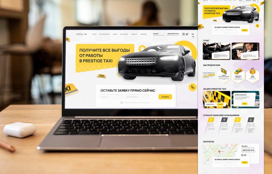 Создание современного, привлекательного и функционального сайта для сервиса Prestige Taxi, ориентированного на привлечение новых водителей и клиентов. Задача заключалась в том, чтобы передать удобство и выгоды сотрудничества с сервисом, а также обеспечить быструю отправку заявок с мобильных и десктопных устройств.
