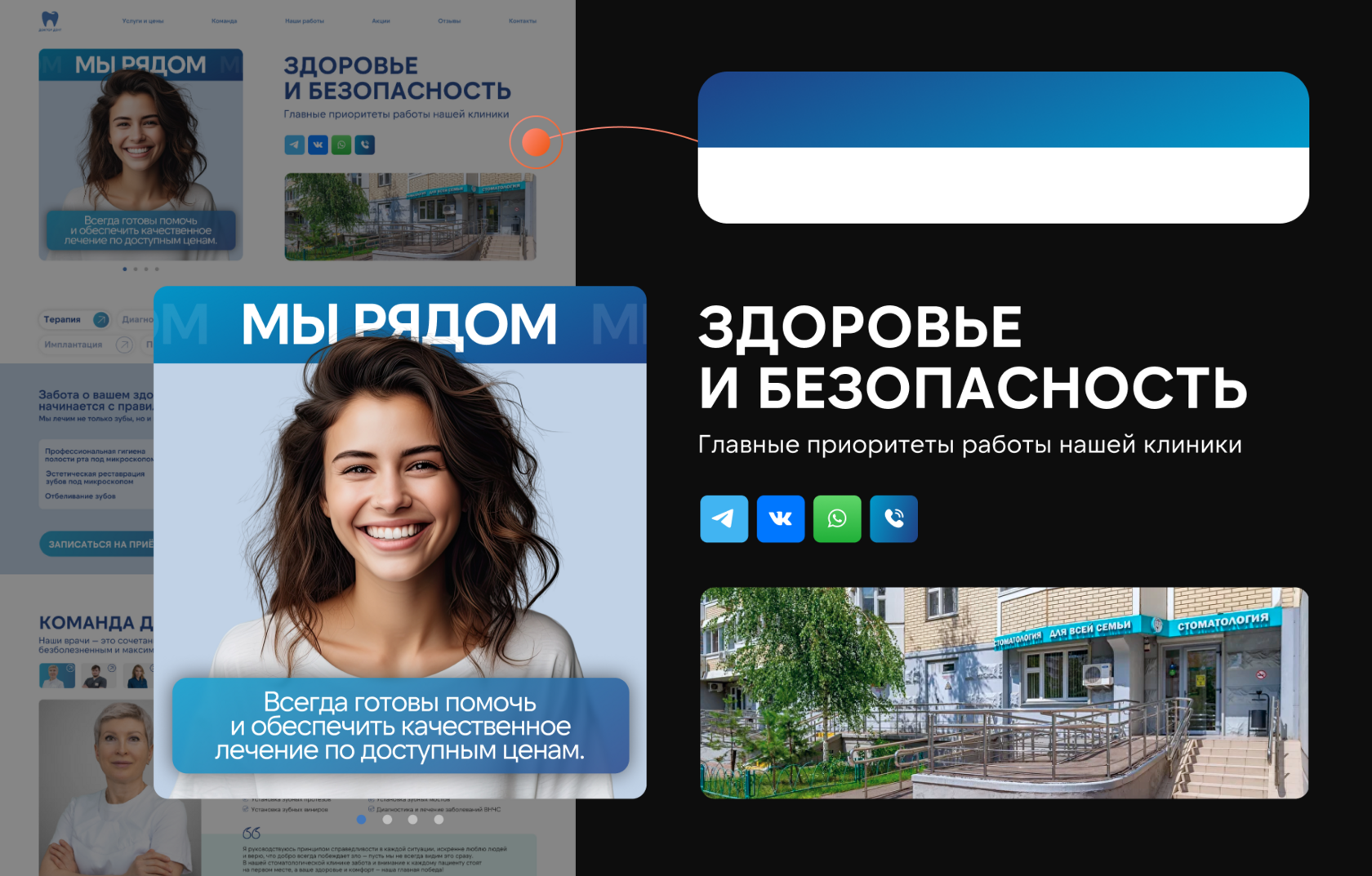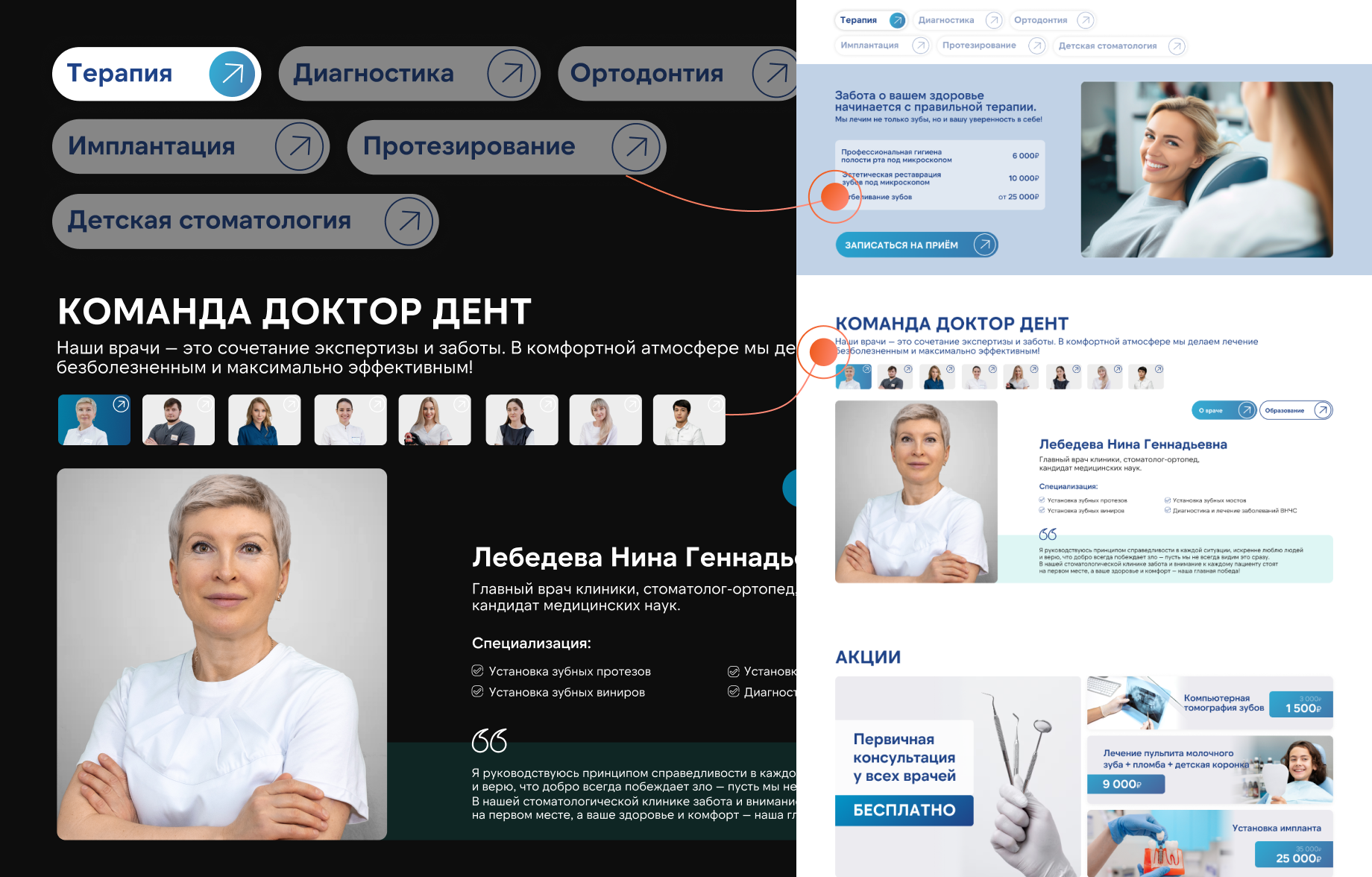 Разработать удобный и информативный сайт, который отражает высокий уровень профессионализма клиники и помогает пациентам быстро находить нужную информацию, а также легко записываться на приём. Важно было подчеркнуть комфорт, безопасность и современный подход к лечению.