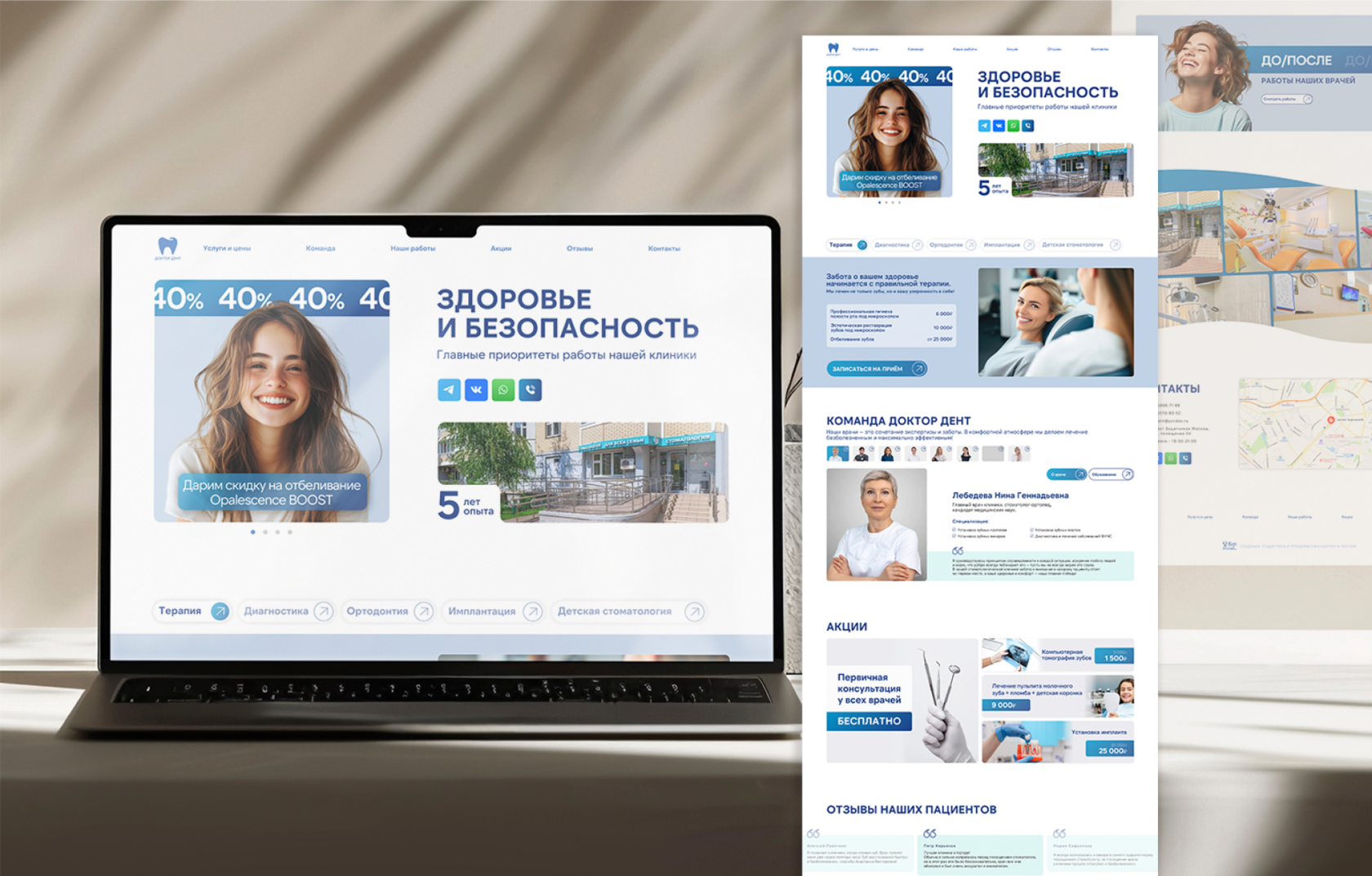 В итоге получился современный, лёгкий и функциональный сайт, который помогает стоматологической клинике в Узбекистане привлекать новых пациентов и формировать положительный имидж за счёт прозрачности информации и удобства использования.