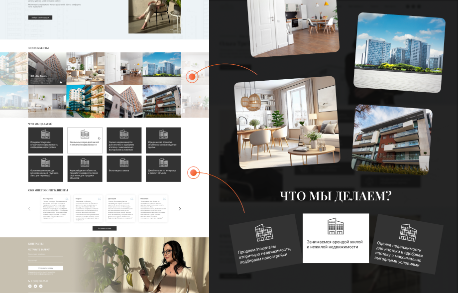 - Блок преимуществ, подчёркивающий уникальный подход к каждому клиенту, прозрачность сделок, юридическое сопровождение и чёткую систему оценки объектов.