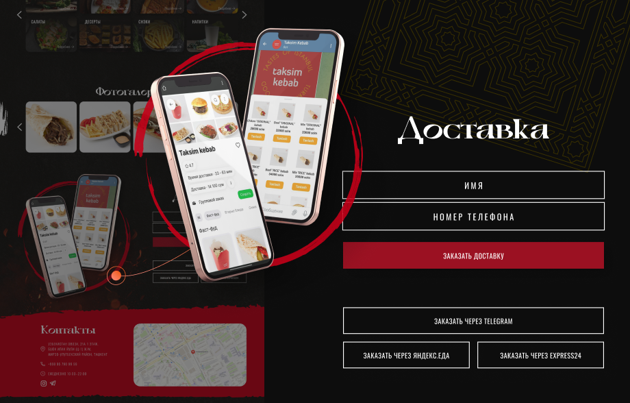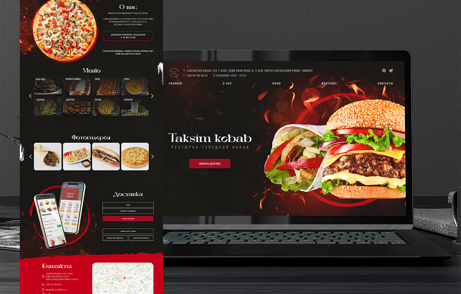 Проект был направлен на создание современного, визуально привлекательного сайта-витрины для ресторана турецкой кухни Taksim Kebab. Цель — не просто представить меню, но и донести философию бренда, вызвать аппетит у пользователя и подтолкнуть к мгновенному оформлению заказа. Сайт должен был стать полноценной онлайн-точкой продаж с интеграцией различных сервисов доставки.