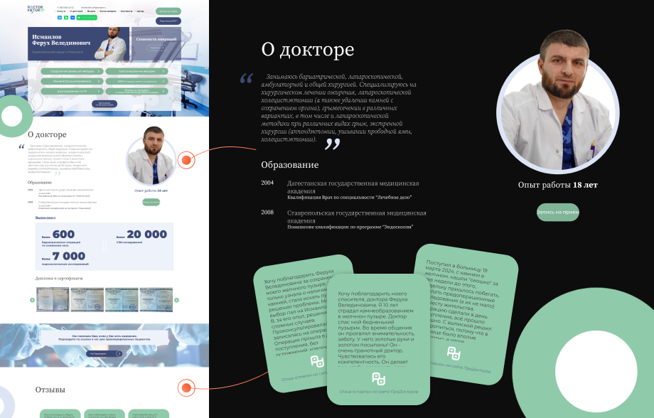 Цель проекта — усилить онлайн-присутствие доктора – опытного бариатрического хирурга в Узбекистане. Важно было создать сайт, который отражает его профессионализм, доверие и заботу, а также предоставляет удобный функционал для записи и общения с пациентами. Сайт выполнен в соответствии с фирменным стилем, чтобы сохранить консистентность визуального языка бренда доктора.