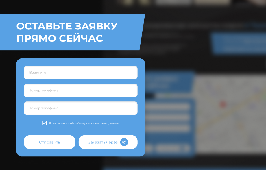 - Форма заявки — яркий блок с призывом оставить заявку прямо сейчас, с возможностью отправки через сайт или мессенджеры для удобства клиентов.