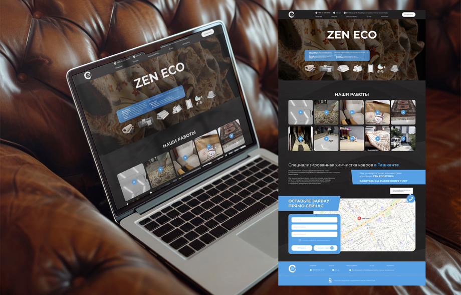 В результате получился современный стильный сайт с высоким уровнем функциональности, который вызывает доверие уже при первом взгляде. ZEN ECO теперь выглядит профессионально и убедительно в глазах потенциальных клиентов: удобная подача информации, живые фотографии выполненных работ и простая форма заявки делают его надежным помощником в развитии локального бизнеса по химчистке в Узбекистане.